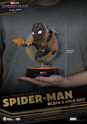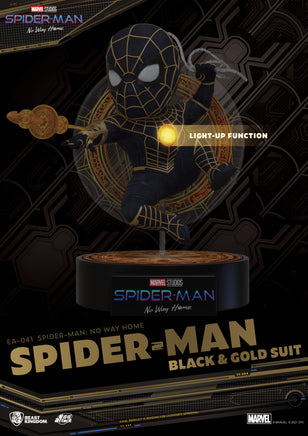 From the experts at Beast Kingdom, present a 6 3/4" high Egg Attack statue of Spider-Man in his black & gold suit from No Way Home. The fabric suit features LED lights, highlighting the intricate clothing details and the black magic emblem on the chest. Perfect for any Spider-Man fan.