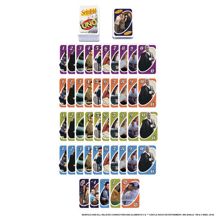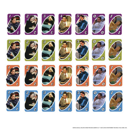 Experience the hilarity and fun of Seinfeld with this UNO card game from Mattel! Match colors and numbers while playing with a deck featuring characters and scenes from the show. With eight special rules inspired by fan-favorite moments, this game is perfect for ages 7 and up. Don't forget to yell "UNO!" when you're down to your last card!